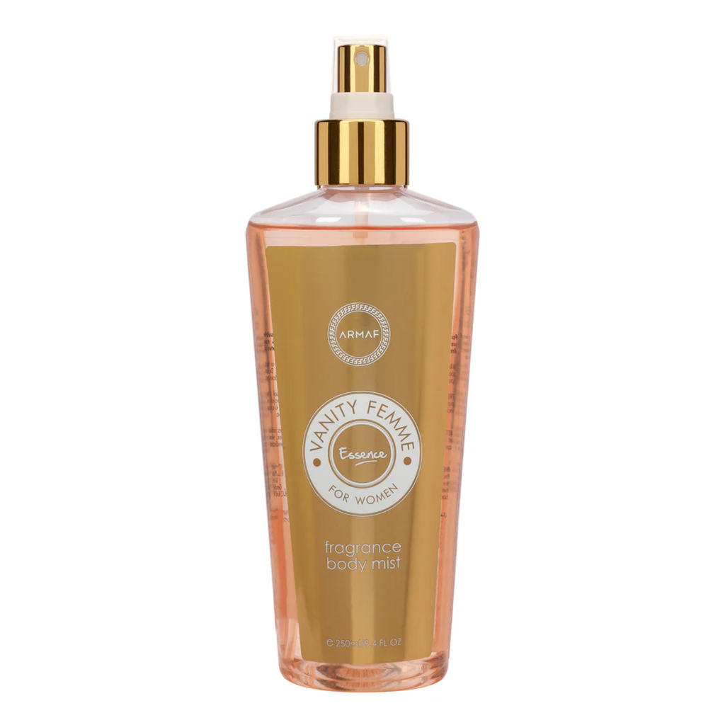 Vanity Femme Essence Mist: A romantic floral-fruity fragrance with luminous blossoms and a warm amber-musky finish. Perfect for women who love sensual elegance.